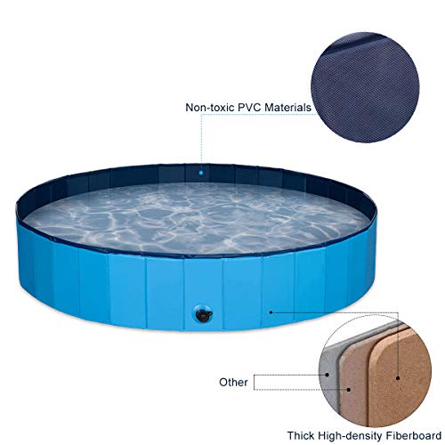 Safe & Sturdy Material: Made of thick density fiber board and extra-tough PVC material, non-slip bottom of the swimming pool prevent sliping, please put the dog pool on flat and smooth ground without sharp objectsand trim your dogs’ nails before using the pool