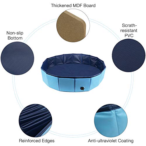 Durable Pet Pool: The pet swimming pool is made of scrath-resistant PVC material, and the bottom is strengthened with double-deck thicker material.The dog pool can hold its shape incredibly well and able to withstand daily use without leaking water.