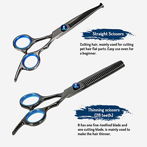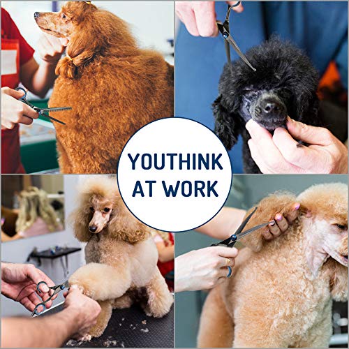 【Make Your Pet Cool】YOUTHINK pet grooming kit comes with 1 x up-curved scissor, 1x down-curved scissor, 1 x thinning shears, 1 x straight shears, 1 x grooming comb, 1 x cleaning cloth and 1 x stylish black leather case. They will cover your pet basic everyday grooming needs. Everything you need in one convenient place