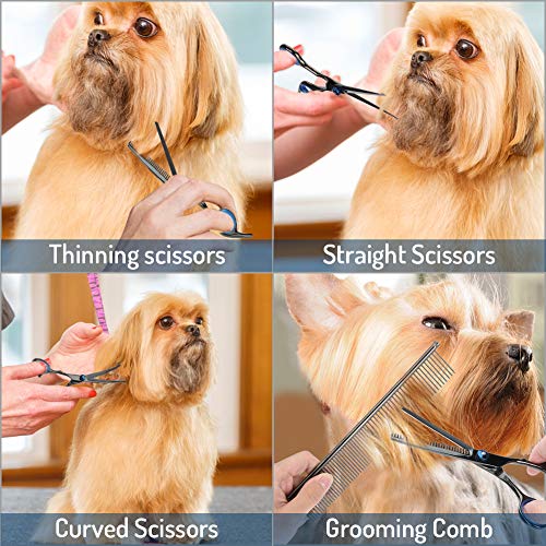 【Multi-Function Scissors for Frecise Trimming】Pet grooming scissors and steel comb is great for removing tangles, mats, loose hair and dirt and stimulating skin and hair follicles. Straight scissor is for cutting hair, mainly used for pet hair flat parts. Thinning scissor is used to thinning hair, The two curved scissors are designed for your pets’ eyelashes, nose, face, ears, belly, hips, etc