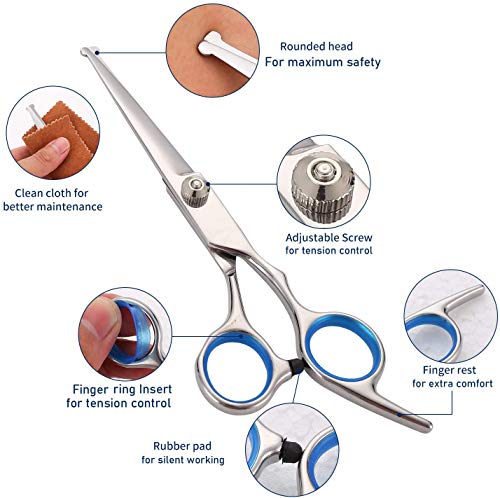 【Round Tip and Muffler Pad】The professional Dog scissors for grooming have a round blunt tip which allows you to trim your pets safely , especially in sensitive areas such as the eyes and ears, meanwhile,the muffler pad between the handles which means quiet grooming for your sensitive cat or dog, less scary to your pets. Dog nail clippers have a protective cover to keep safe