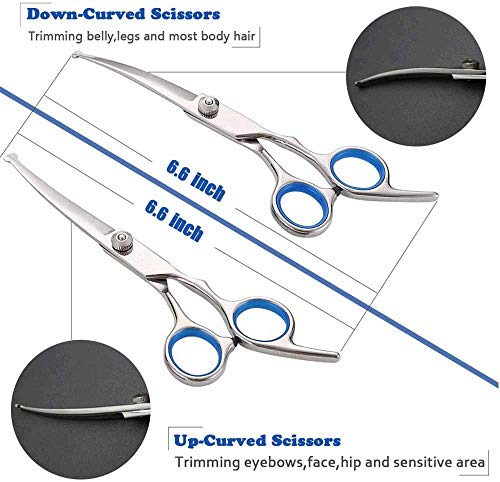 【Rich Grooming Tools】The dogs grooming shears set comes with straight scissors×1, thinning scissors×1, up-curved scissors×1, down-curved scissors×1, comb×1,nice zippered storage case×1, cleaning cloth×1.Extra tools of pet nail cliper & nail file,So it can trim any part of your pet such as body, face, nose, ear, tail, paw even nails.