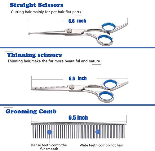 【Sharp and Durable】This dogs grooming scissors kit made in high-end 4CR stainless steel.Sharp and smooth stainless steel blade works great for detailing, trimming, thinning,to make the cutting clean and precisely without pulling&stucking hair.Maintain after trimming to ensure that scissors can be used for many years and keep best efficiency
